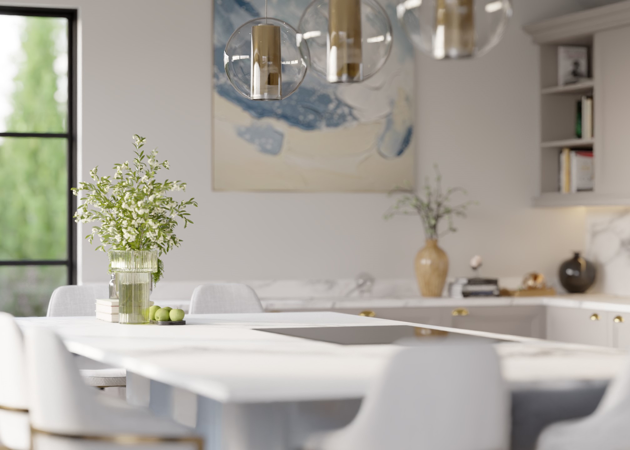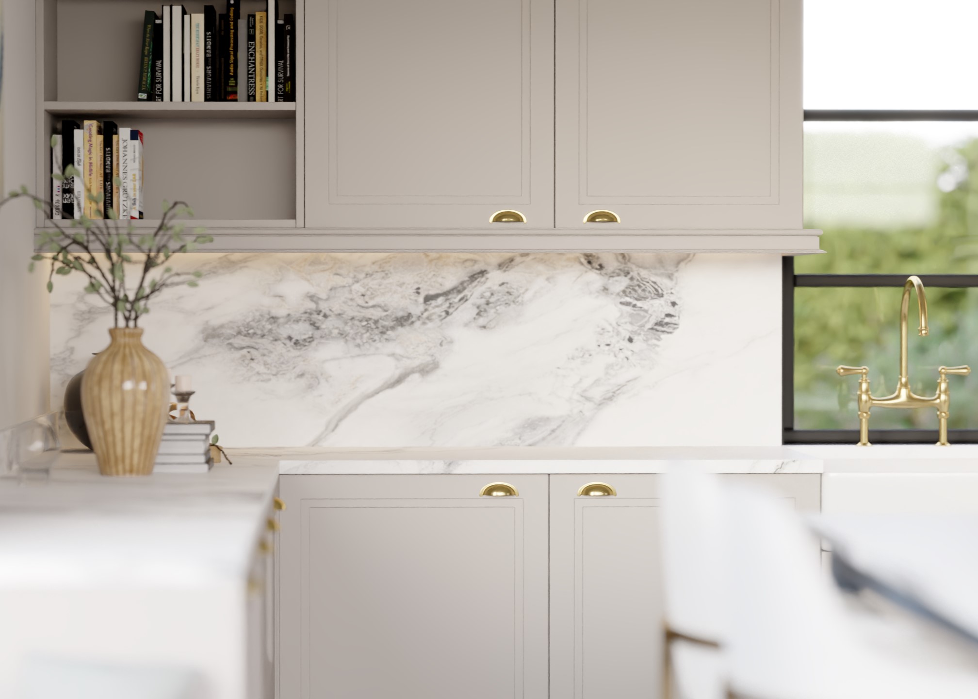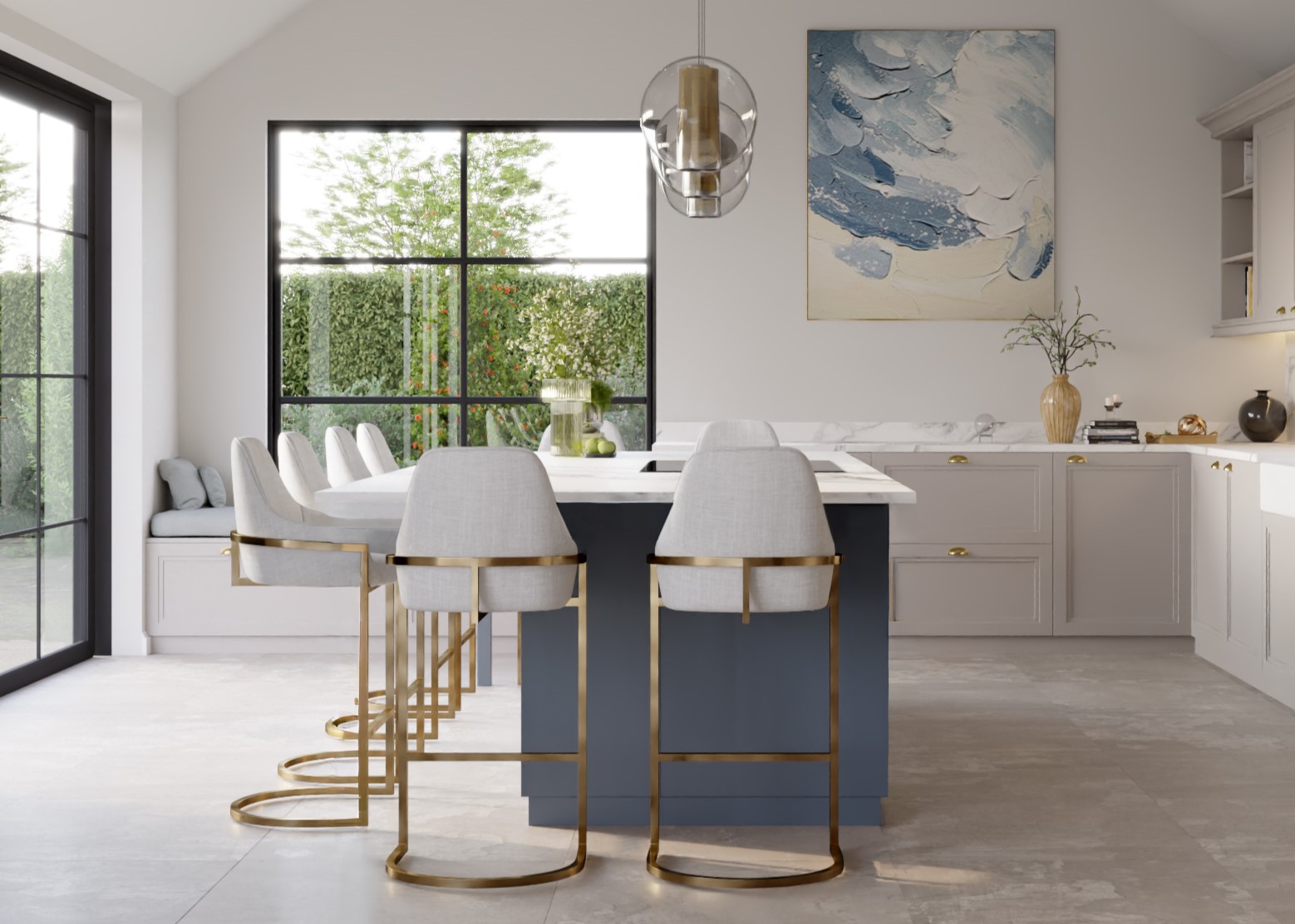 This stunning shaker-style kitchen brings light coastal hues and combines classic design with modern elements. The Cypress Blue colour pairs beautifully with neutral kitchen tones and offers a calm, inviting atmosphere. Gold accents bring traditional shaker cabinetry to life, whilst the gleaming veined stone worktop reflects natural light effortlessly, allowing for a bright and serene space. Maximising both space and style, the statement island is the centrepiece of this design, serving as the perfect spot to cook, socialise and relax.